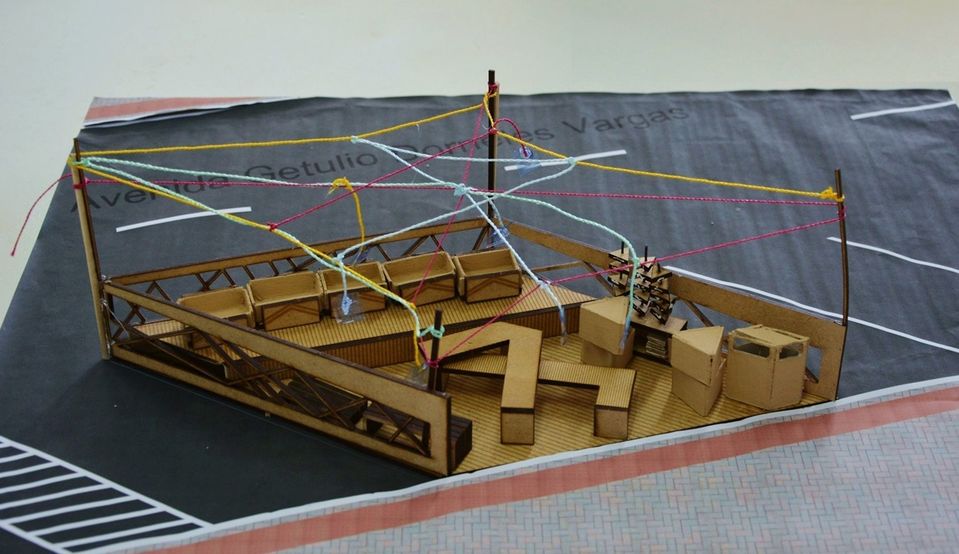 - Etapa de Execução da Proposta: Etapa constituída pelo detalhamento do projeto vencedor, com os devidos ajustes mediante a percepção de possíveis problemas identificados com o modelo reduzido e execução em tamanho real pela equipe. Esta etapa ainda está sendo desenvolvida. Foram desenvolvidos detalhamentos e ajustes no projeto e no momento deu-se início à fase de cortes e pré-montagem no pátio da instituição. O material utilizado para o modelo em escala 1:1 constitui-se por MDF 18 mm e os cortes serão executados na CNC. A montagem in loco está prevista para agosto de 2015.